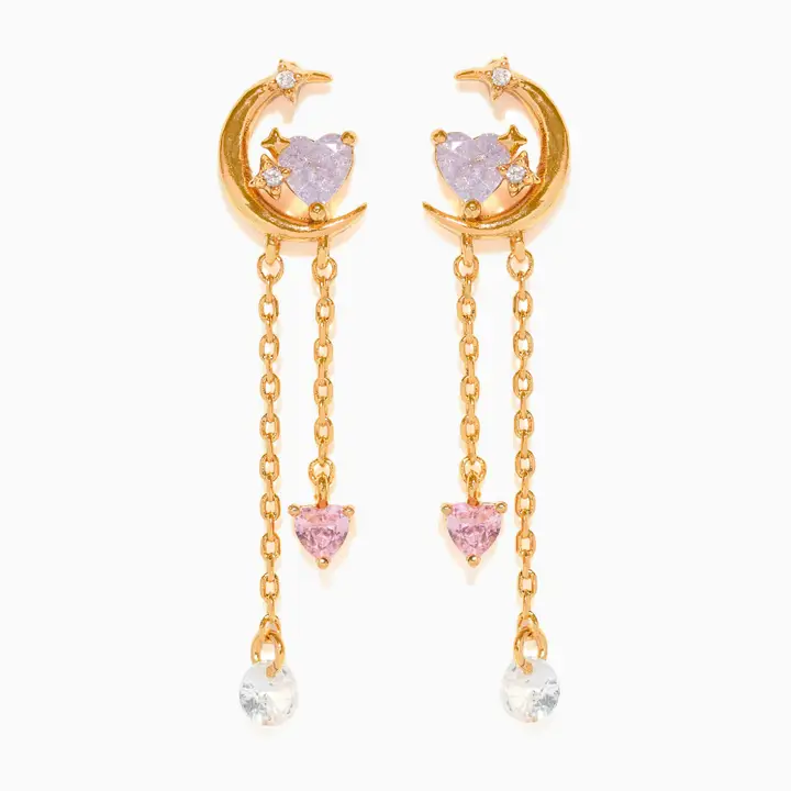 Cosmic Love Dangle Earrings, featuring a sweet pink heart with a crescent moon. With teardrop and heart-shaped stones that sparkle with every move, they’re like wearing a little piece of the night sky.