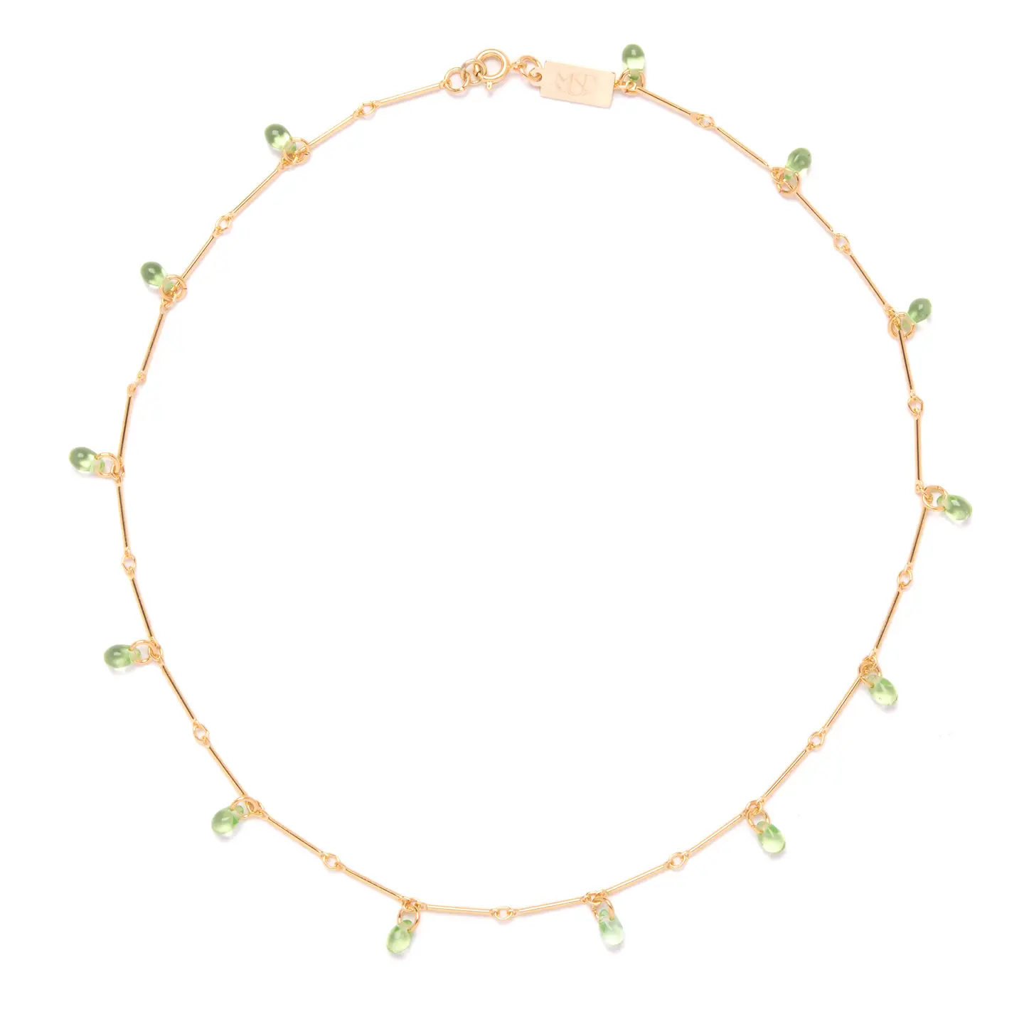 Gold plated brass bar chain Vintage glass teardrops in peridot
